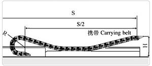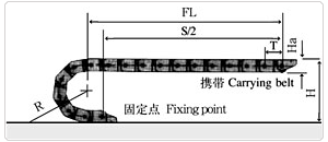 ◆相同系列的拖链内高、外高、节距相同.拖链内高、弯曲半径R可有不同的选择。